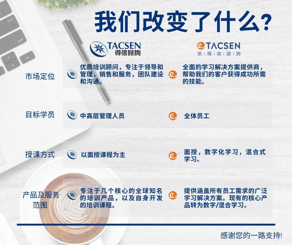 在这势头上,杨良得先生带领团队乘势而上,在2020年的新年伊始全面完成了公司的企业标识更新升级,在原来“TACSEN”之前加上“e”(中文译名从”得信“更改为”依得信“。)并与全球领先的数字化学习解决方案提供商Skillsoft成为了战略合作伙伴的关系。